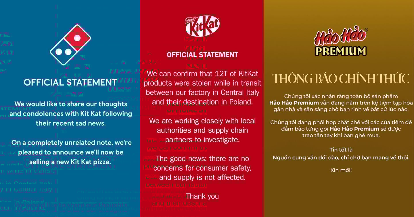 Thay vì chỉ thông báo sự cố theo cách nghiêm trọng, KitKat chọn cách truyền thông chủ động hơn khi lồng ghép yếu tố hài hước vào phát ngôn chính thức. Cách xử lý này không chỉ giúp giảm bớt căng thẳng của vụ việc mà còn nhanh chóng biến câu chuyện thành chất liệu để cộng đồng và nhiều thương hiệu khác tham gia “đu trend”.